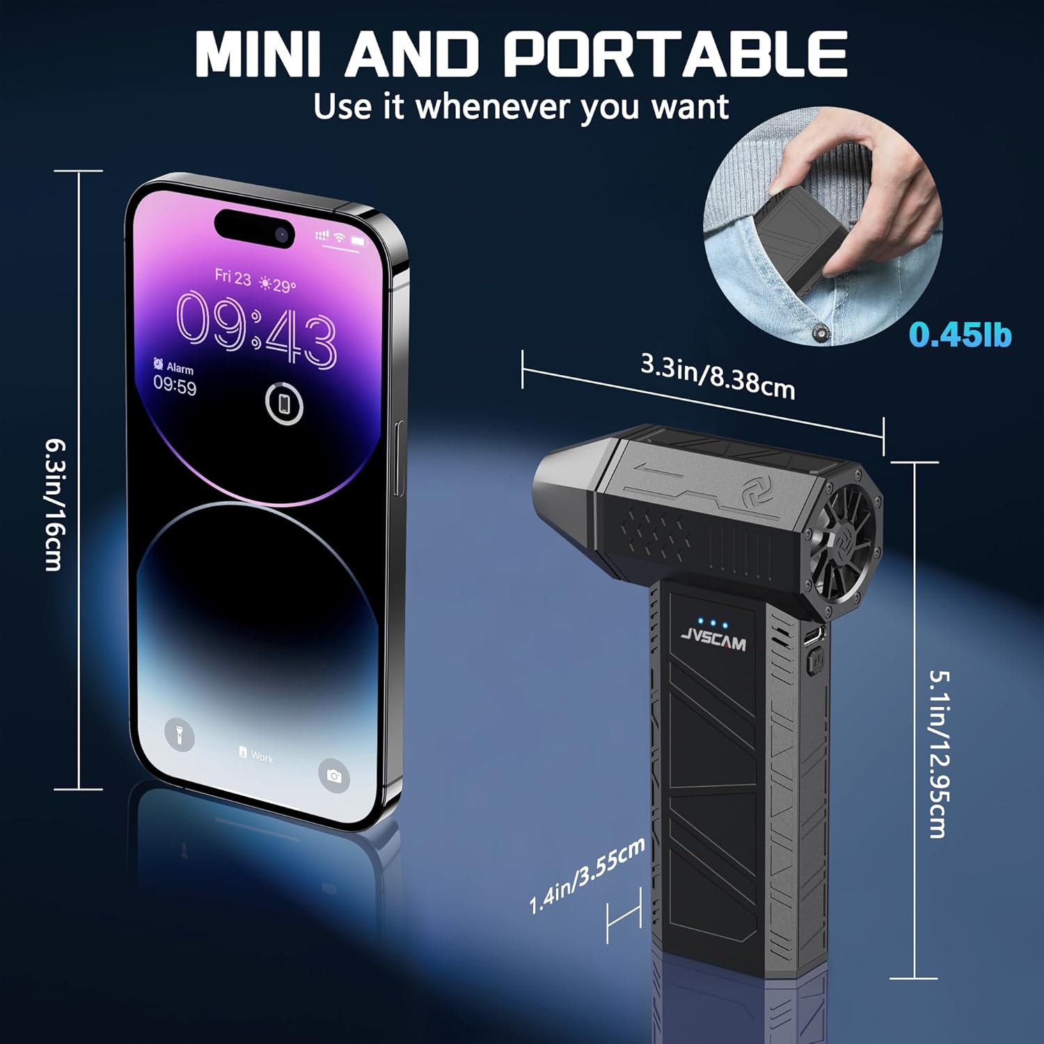 Compact & Portable: True pocket mini air blower. The size of this mini turbofan is (5.1*3.3*1.4in). Small size and light weight (only 0.45 pounds). Easy to carry and store. You can easily store it in a toolbox, tote bag or even pocket without taking up too much space. Easy to use anytime, anywhere.